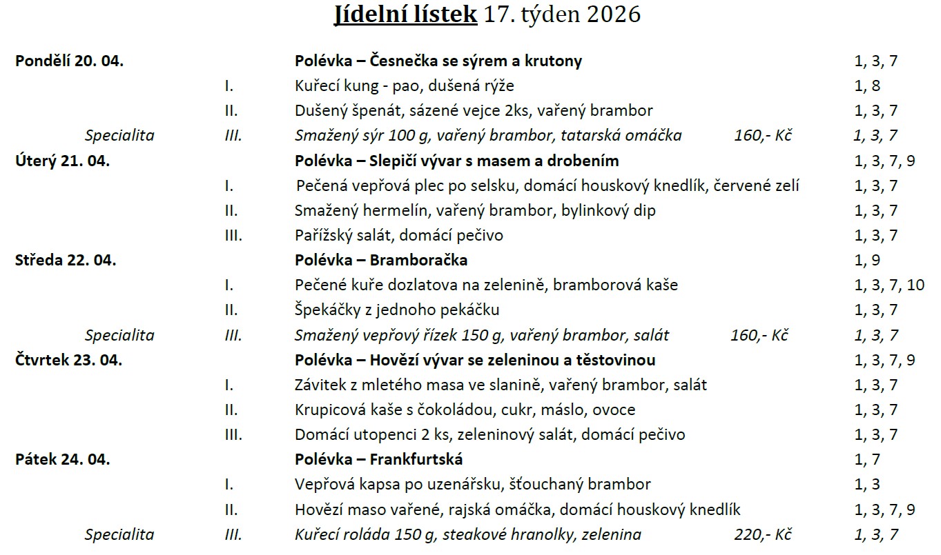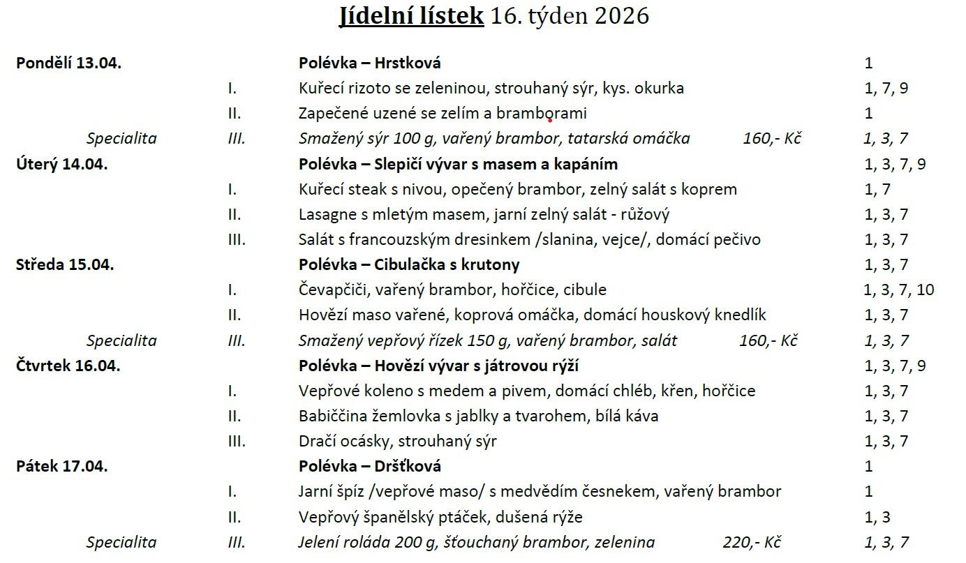 Cena poledního menu je od 01. 04. 2026 120,- Kč s DPH, včetně dopravy.